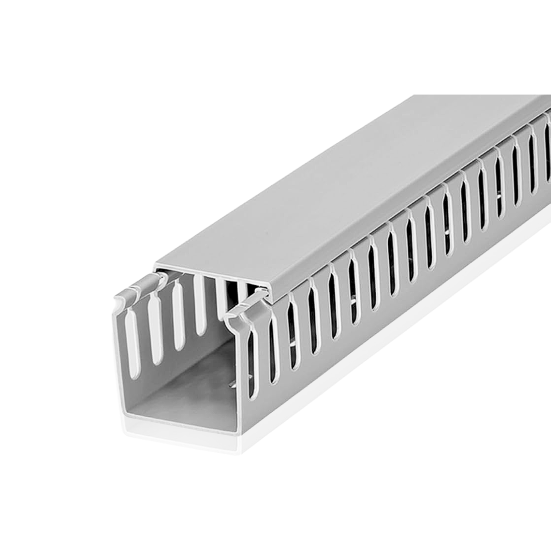 รางเก็บสายไฟโปร่ง (Wire Duct) สีเทา เป็นอุปกรณ์ที่ออกแบบมาเพื่อการจัดระเบียบสายไฟภายในอาคาร เช่น ระบบไฟฟ้า ระบบคอนโทรล หรือระบบเครือข่ายคอมพิวเตอร์ โดยเฉพาะในพื้นที่ที่ต้องการการระบายอากาศที่ดีและการเข้าถึงสายไฟที่สะดวก