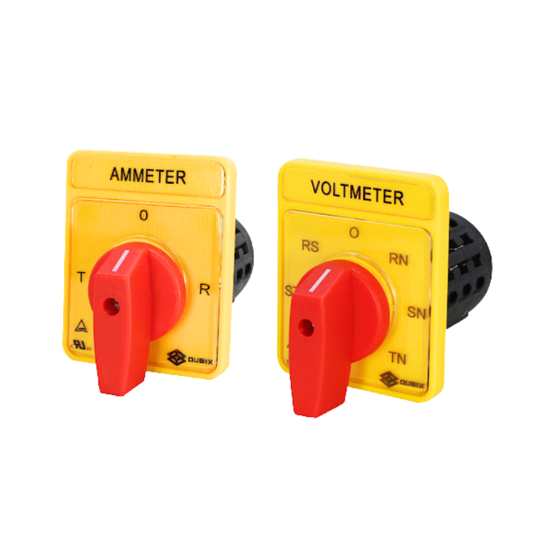 คือสวิตช์หมุน (Rotary Selector Switch) ที่ใช้สำหรับเลือกหรือปรับการทำงานของวงจรกระแสไฟฟ้าในระบบควบคุมไฟฟ้า ขนาดหน้าปัด 64x80 มิลลิเมตร สีแดงและเหลือง ผลิตโดยแบรนด์ QUBIX