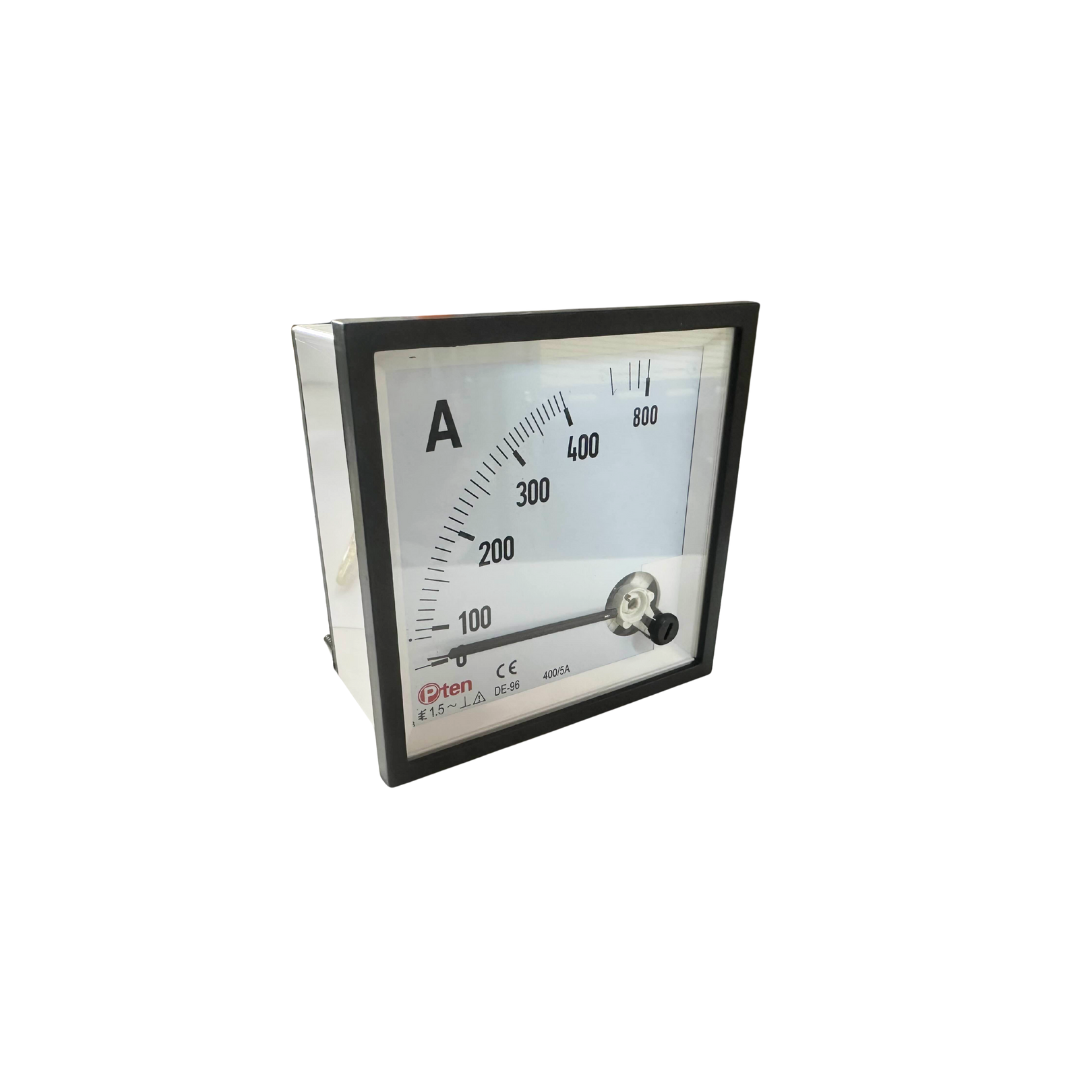 DE-96A คือ แอมป์มิเตอร์แบบอนาล็อกสำหรับติดตั้งบนแผงควบคุม (Panel Meter) ยี่ห้อ Pten ใช้สำหรับวัดกระแสไฟฟ้าในระบบ AC ซึ่งมีขนาดมาตรฐาน 96x96 มิลลิเมตร และมีรุ่นให้เลือกหลายยี่ห้อหลายช่วงการวัด โดยมักต้องต่อผ่านหม้อแปลงกระแส (CT)